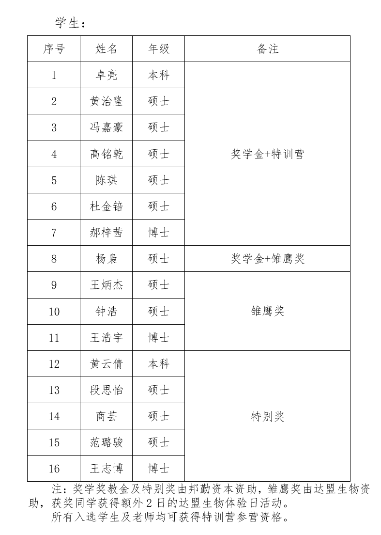 按照《2025年邦勤奖学奖教金暨第四届“生命健康产业邦勤特训营”计划申请办法》的相关规定,经个人申报、现场答辩和小组内部评审,现将2025年邦勤奖学奖教金暨第四届“生命健康产业邦勤特训营”计划评定结果公示如下: