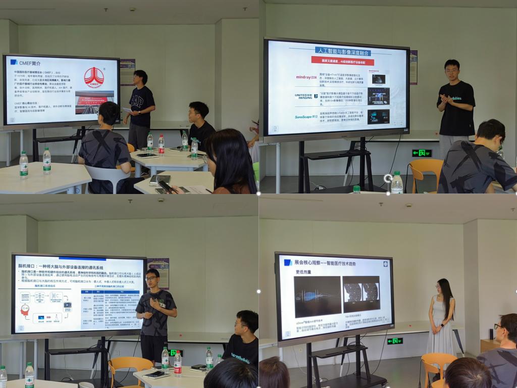 研究生专场则呈现出更深入的技术分析和产业思考。袁润同学在《国产医疗器械的崛起之路》中,以迈瑞全光纤体征监测仪、联影光子计数CT等突破性产品为例,揭示了国产器械从“跟跑”到“领跑”的艰辛历程,并指出核心部件自主化与AI安全性评估等关键挑战。黄治隆同学围绕《医疗影像的自主创新路径》,分析了全球市场格局,展示了联影“元智”大模型的影像诊断应用及东软双宽体CT、迈瑞无液氦磁共振等硬件创新,强调“产学研医”协同对转化至关重要。王博韬同学描绘了《脑机接口的产业化图景》,对比侵入式与非侵入式技术,分享了脑虎科技临床进展与强脑科技消费产品,展望“脑机接口+AI”在神经疾病治疗中的巨大潜力。霍平平同学以《智能驱动与交叉赋能》为题,聚焦联影AI导航CT、迈瑞全链路影像传输等技术,表示智能化与精准化是行业核心引擎,作为青年学子要立足临床痛点推动创新。